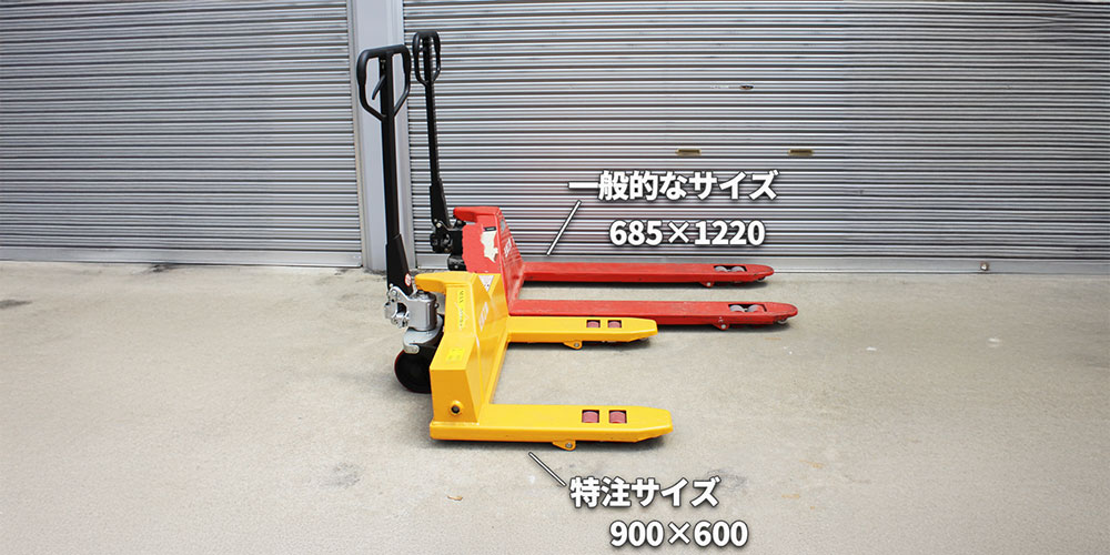 一方、幅広ハンドリフトはフォークの外幅が約800mm以上(当店では900~1000mm)に設計されている特殊なモデルです。