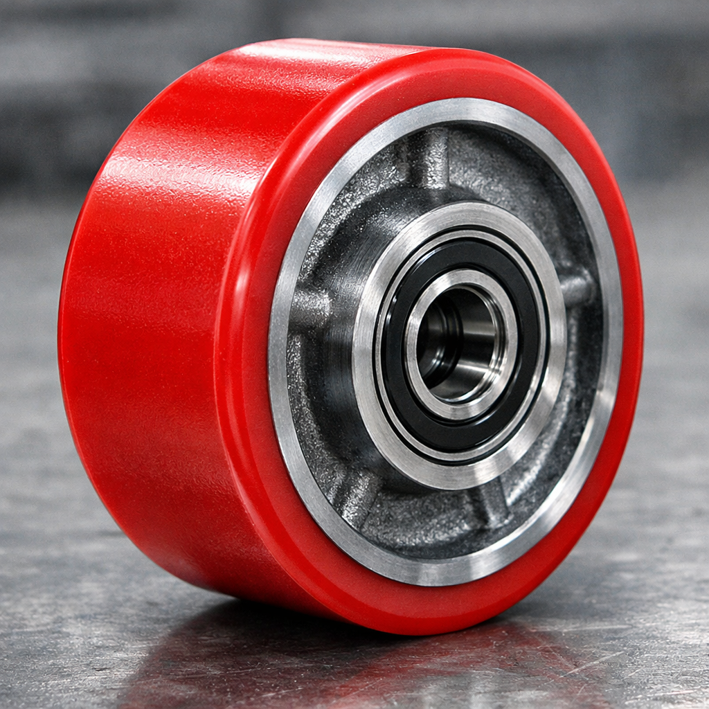 耐摩耗性に優れ、コンクリート床や倉庫内での頻繁な走行にも強く、長期間にわたって安定した使用が可能です。適度な弾性があるため、走行時の振動や衝撃を吸収し、騒音を抑えながらスムーズな転がりを実現します。